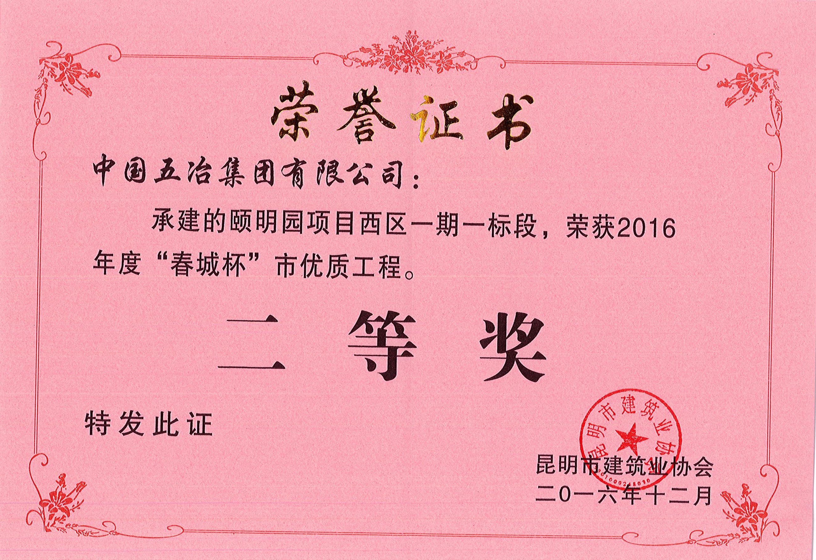 颐明园项目西区一期一标段—2016年度昆明市春城杯二等奖