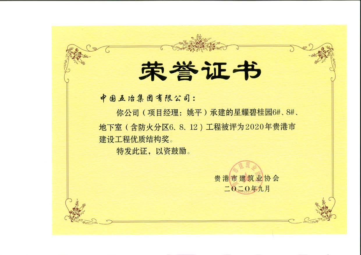 星耀碧桂园6#、8#、地下室工程—2020年贵港市建设工程优质结构奖